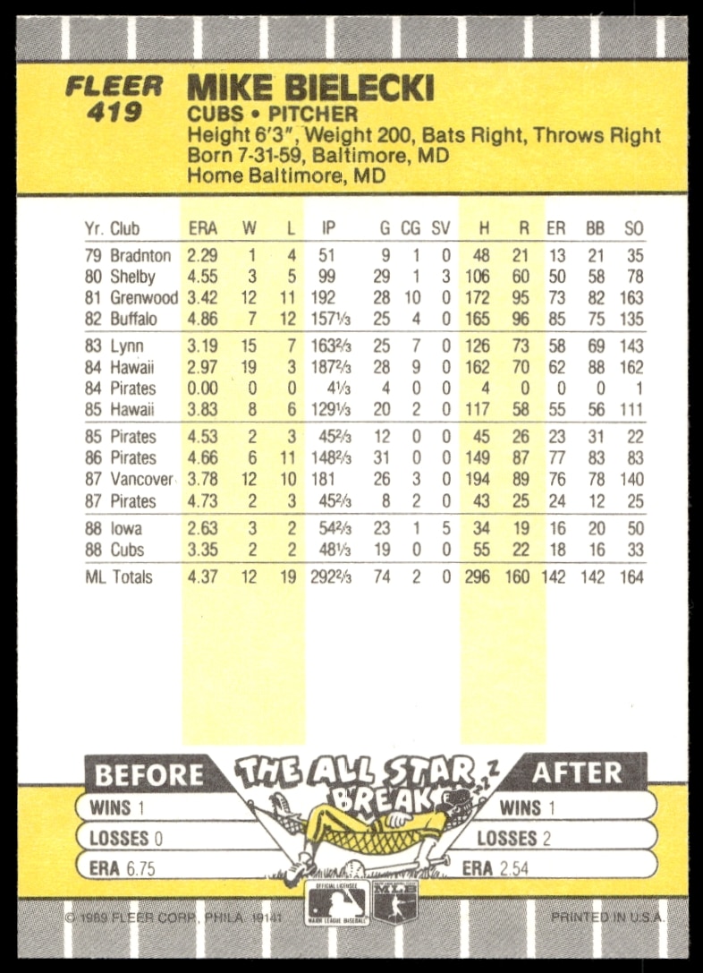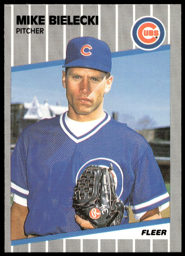 This Baseball card, from 1989 is part of the Fleer card set. Mike Bielecki is featured and has a card number of 419.