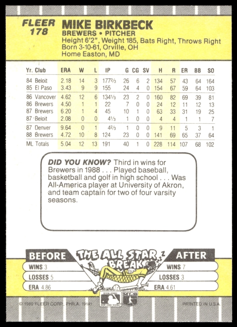 This Baseball card, from 1989 is part of the Fleer card set. Mike Birkbeck is featured and has a card number of 178.