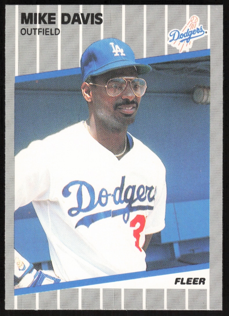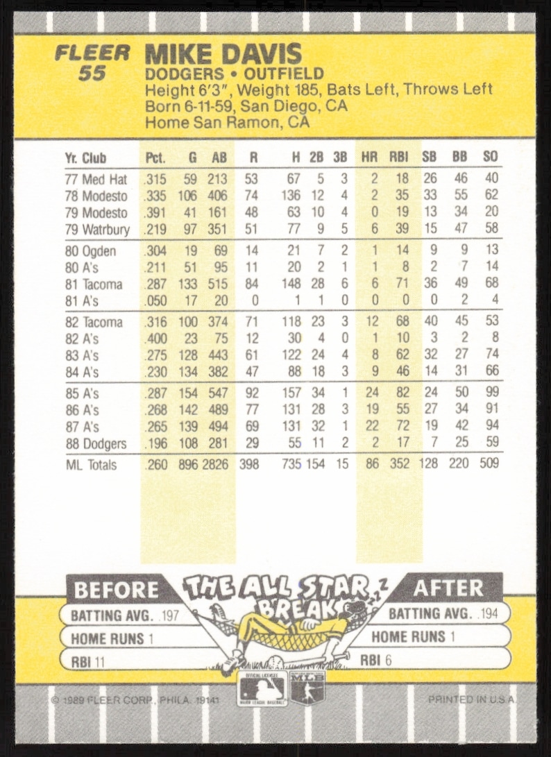 This Baseball card, from 1989 is part of the Fleer card set. Mike Davis is featured and has a card number of 55.
