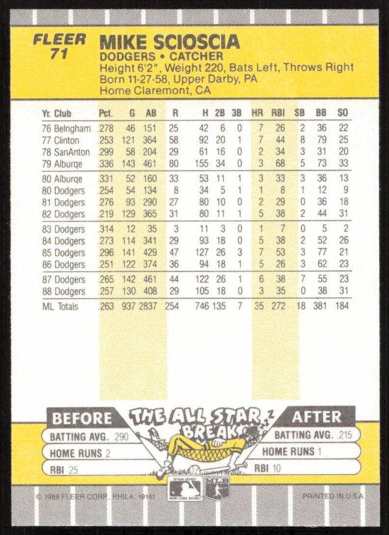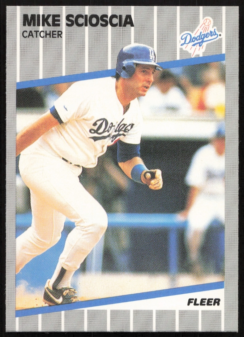 This Baseball card, from 1989 is part of the Fleer card set. Mike Scioscia is featured and has a card number of 71.