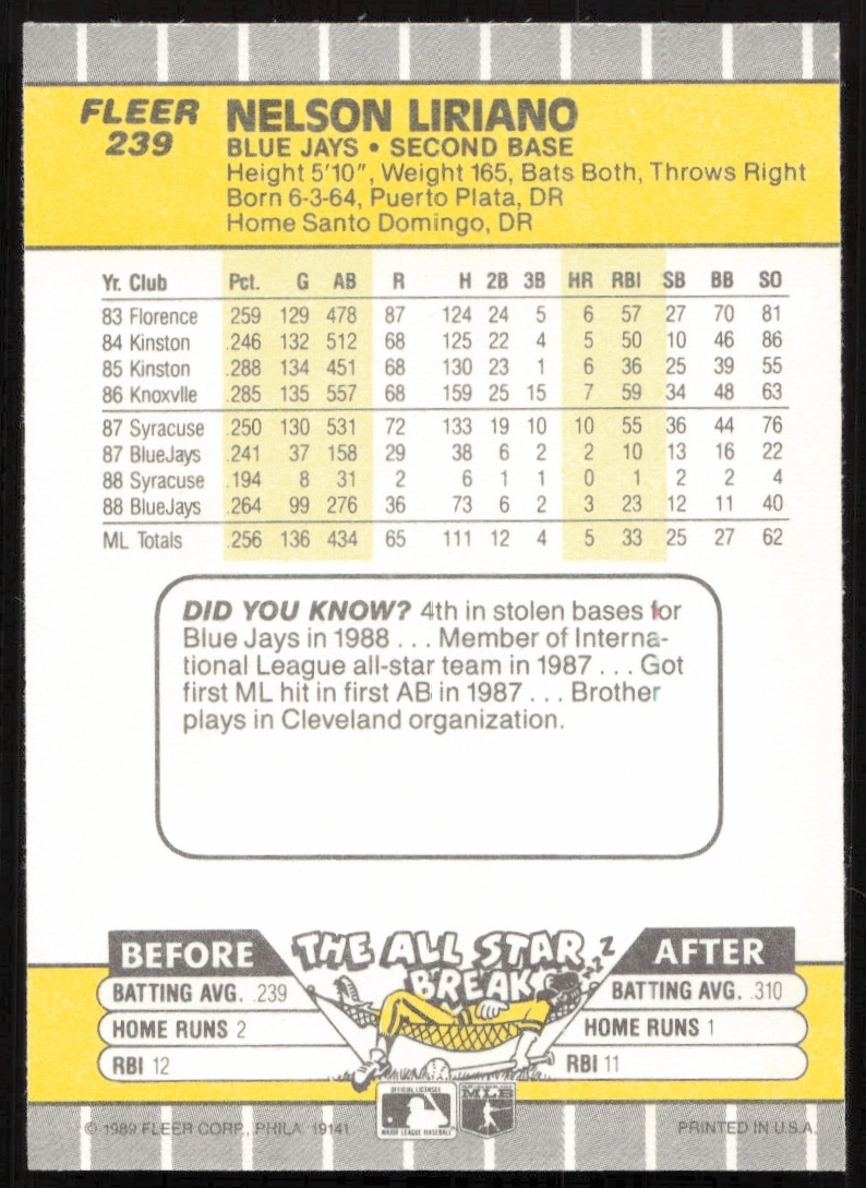 This Baseball card, from 1989 is part of the Fleer card set. Nelson Liriano is featured and has a card number of 239.
