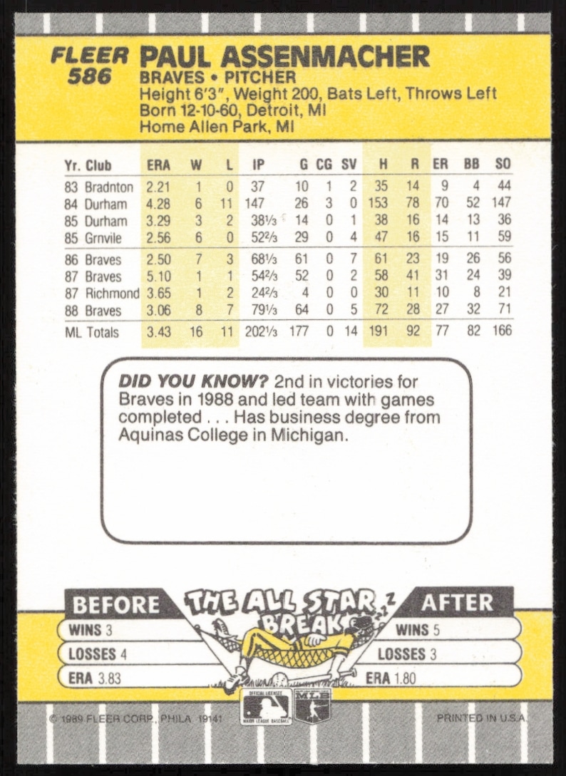 This Baseball card, from 1989 is part of the Fleer card set. Paul Assenmacher is featured and has a card number of 586.