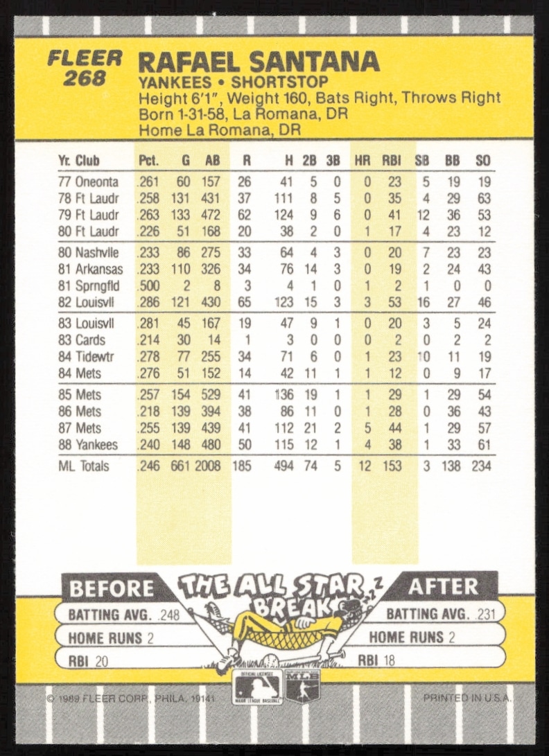 This Baseball card, from 1989 is part of the Fleer card set. Rafael Santana is featured and has a card number of 268.