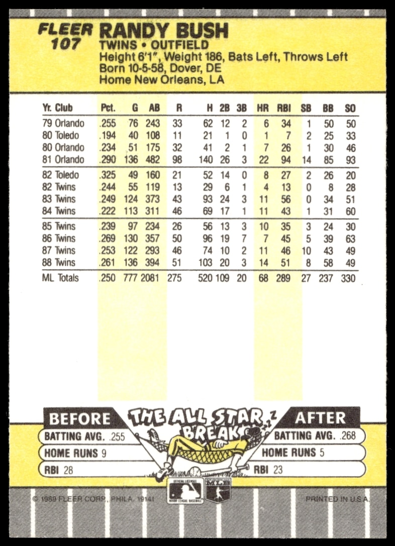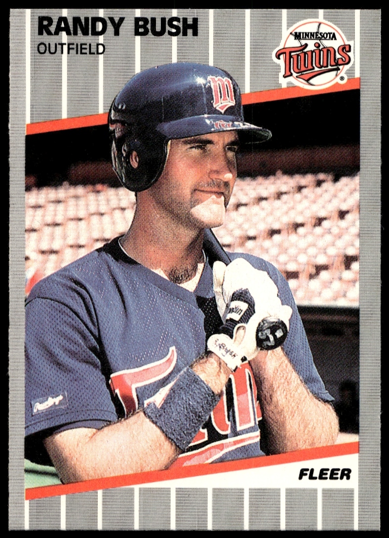 This Baseball card, from 1989 is part of the Fleer card set. Randy Bush is featured and has a card number of 107.