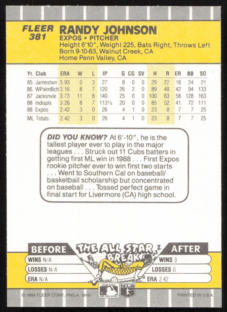 This Baseball card, from 1989 is part of the Fleer card set. Randy Johnson is featured and has a card number of 381.