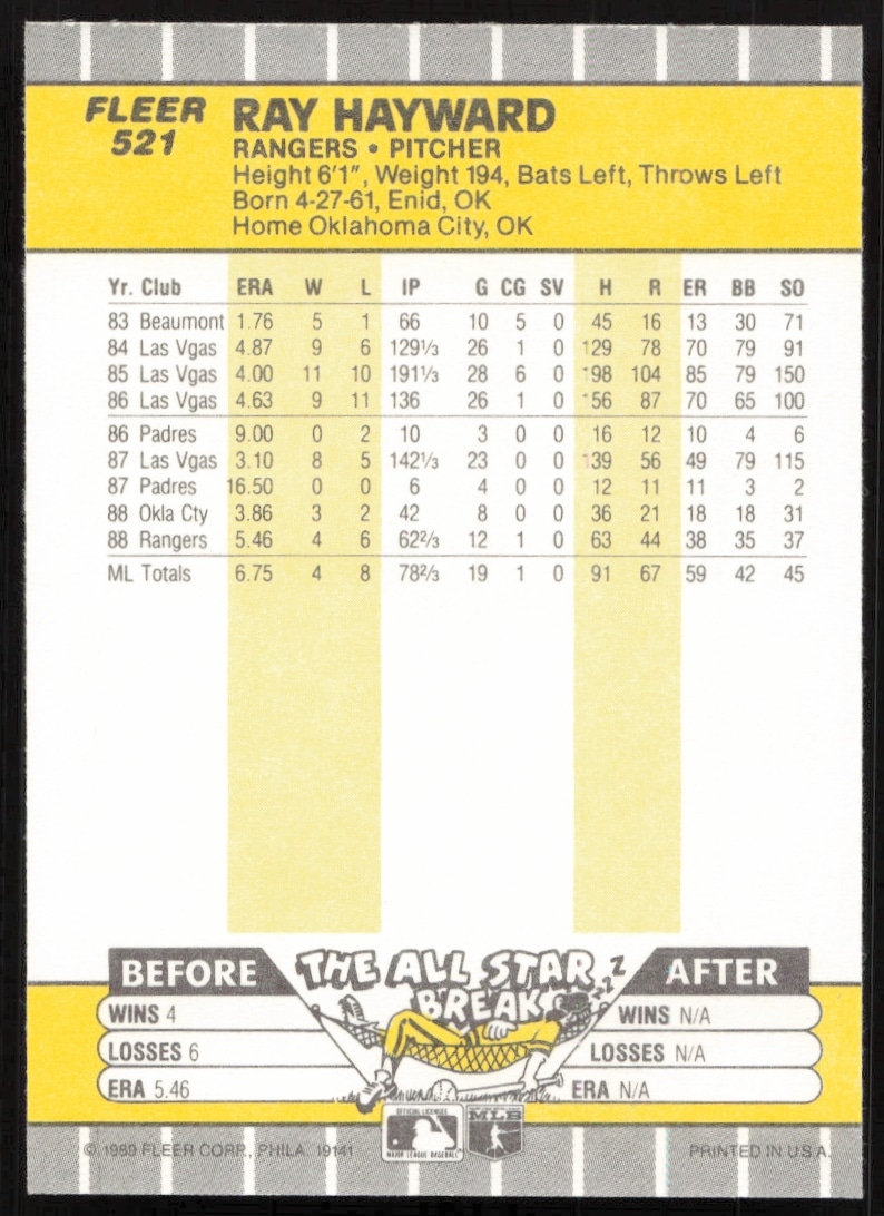 This Baseball card, from 1989 is part of the Fleer card set. Ray Hayward is featured and has a card number of 521.