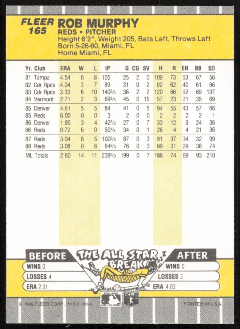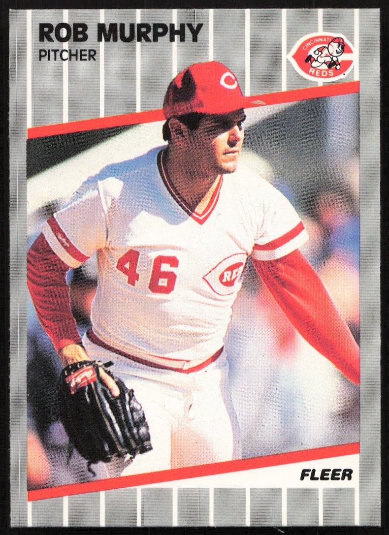 This Baseball card, from 1989 is part of the Fleer card set. Rob Murphy is featured and has a card number of 165.