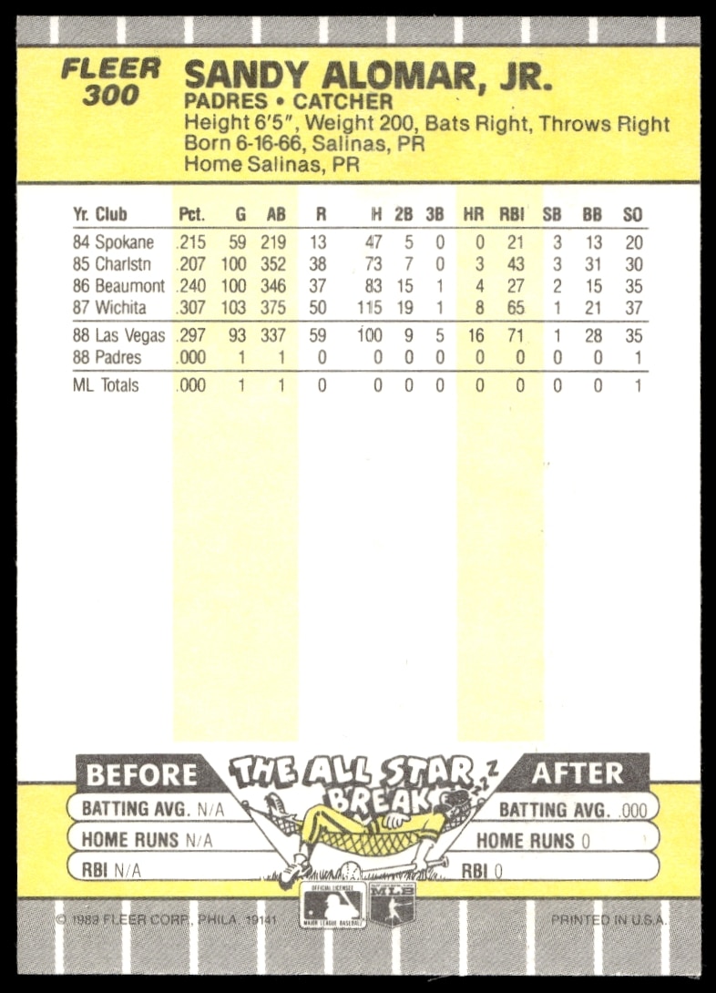 This Baseball card, from 1989 is part of the Fleer card set. Sandy Alomar Jr. is featured and has a card number of 300.