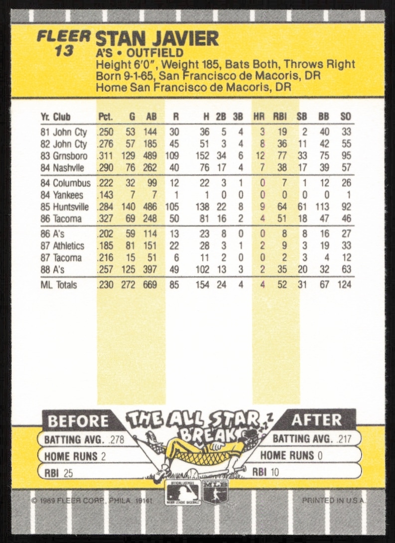 This Baseball card, from 1989 is part of the Fleer card set. Stan Javier is featured and has a card number of 13.