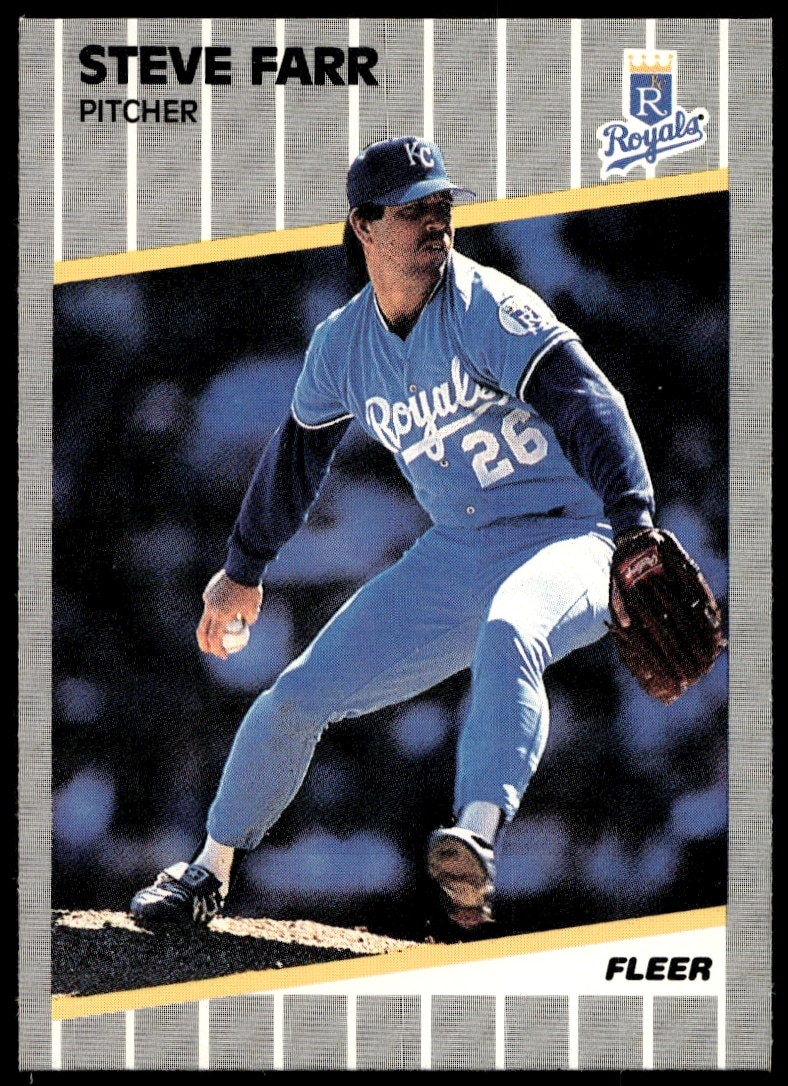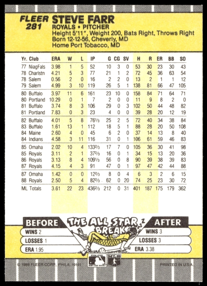 This Baseball card, from 1989 is part of the Fleer card set. Steve Farr is featured and has a card number of 281.