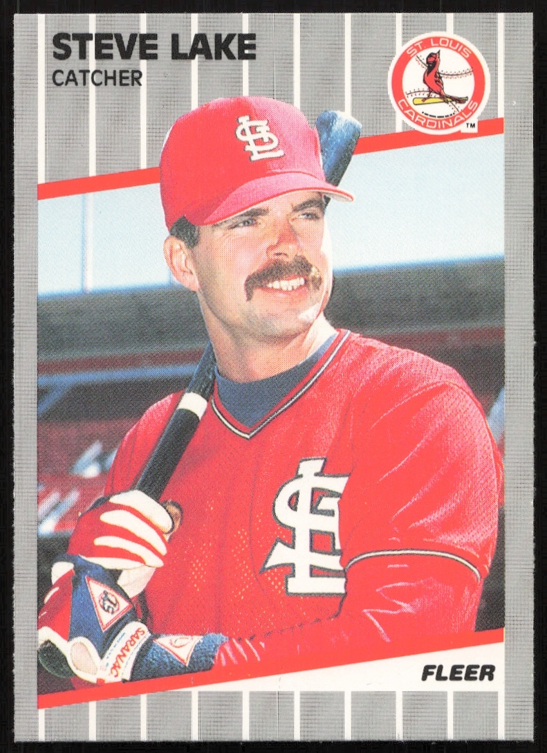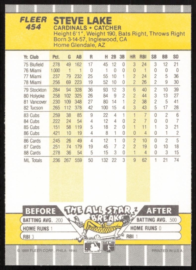 This Baseball card, from 1989 is part of the Fleer card set. Steve Lake is featured and has a card number of 454.