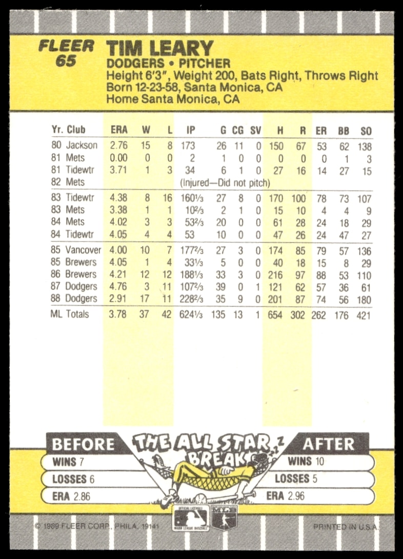 This Baseball card, from 1989 is part of the Fleer card set. Tim Leary is featured and has a card number of 65.