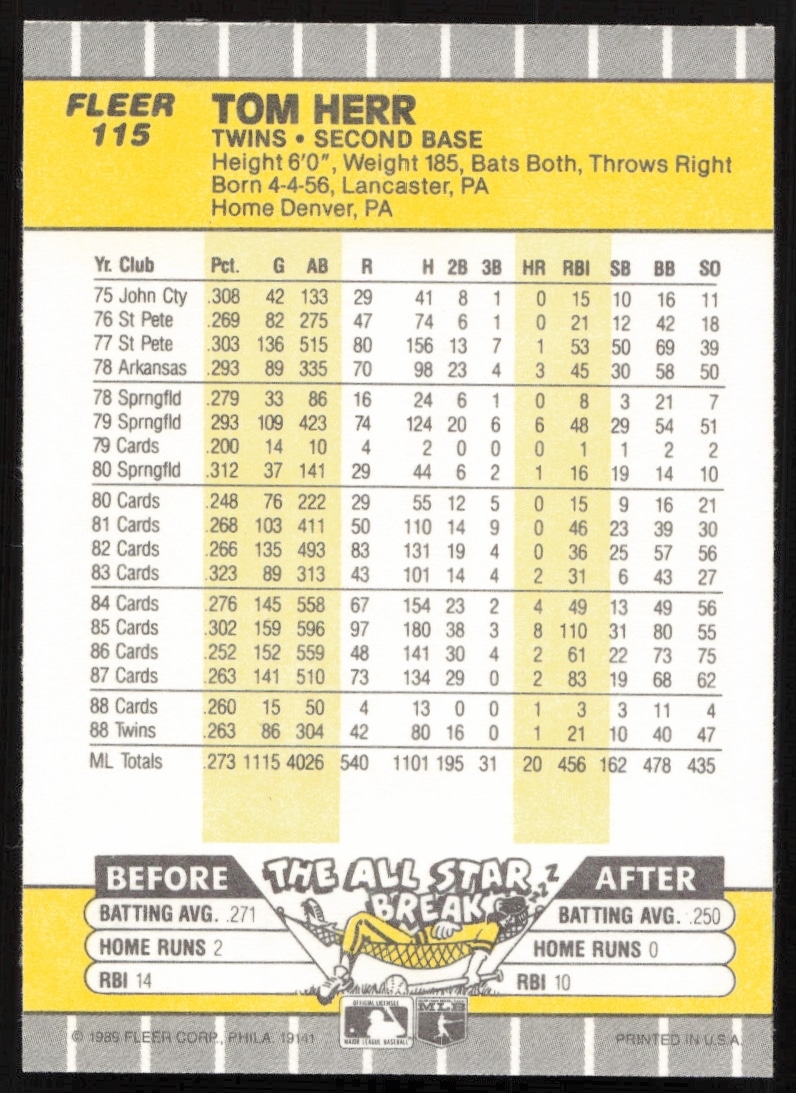 This Baseball card, from 1989 is part of the Fleer card set. Tom Herr is featured and has a card number of 115.
