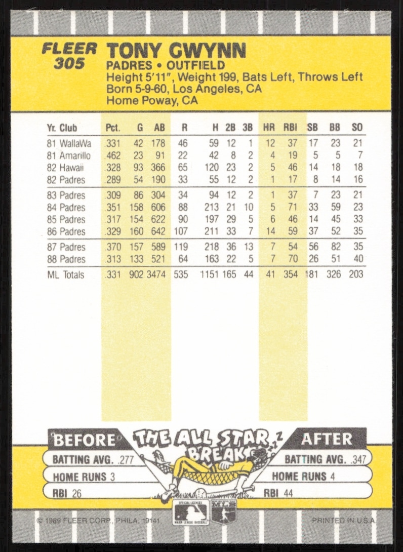 This Baseball card, from 1989 is part of the Fleer card set. Tony Gwynn is featured and has a card number of 305.