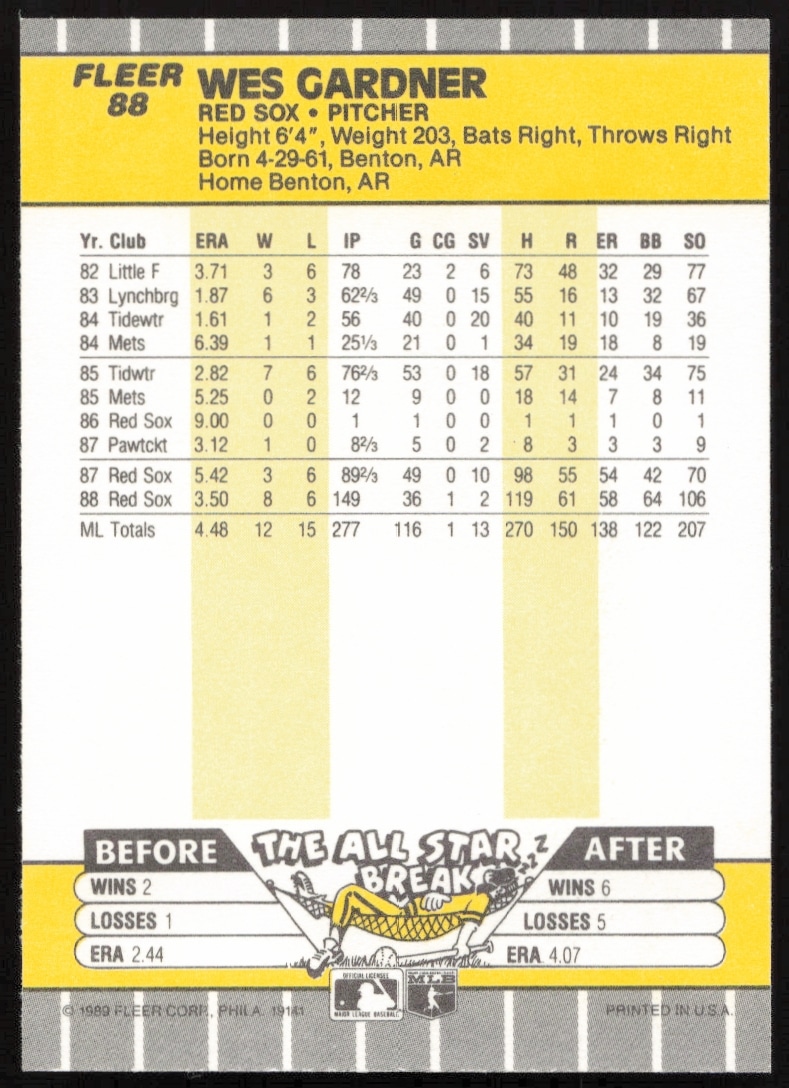This Baseball card, from 1989 is part of the Fleer card set. Wes Gardner is featured and has a card number of 88.