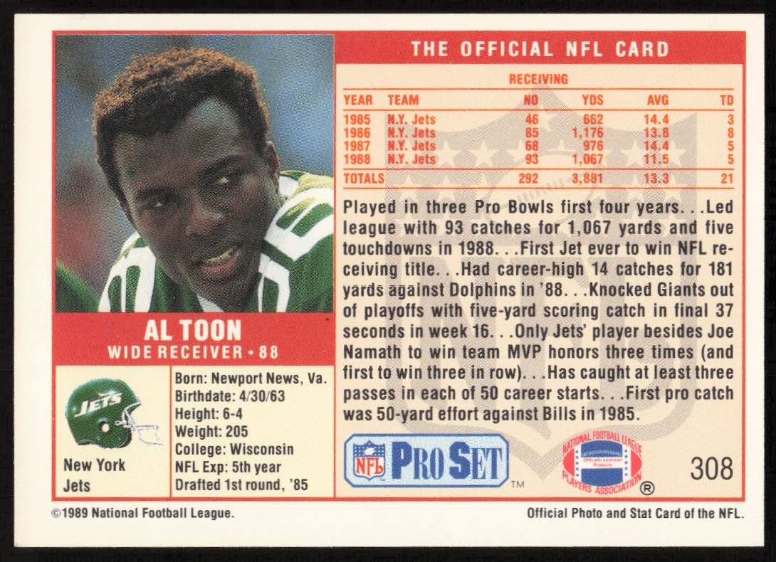 This Football card, from 1989 is part of the Pro Set card set. Al Toon is featured and has a card number of 308.