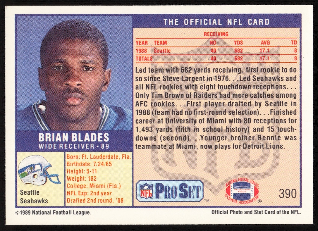 This Football card, from 1989 is part of the Pro Set card set. Brian Blades is featured and has a card number of 390.