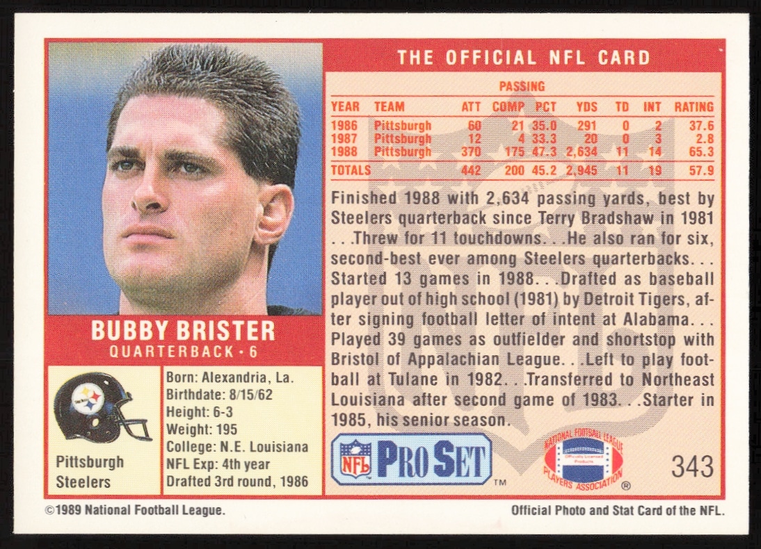 This Football card, from 1989 is part of the Pro Set card set. Bubby Brister is featured and has a card number of 343.