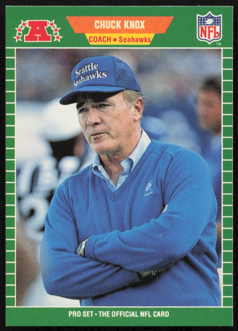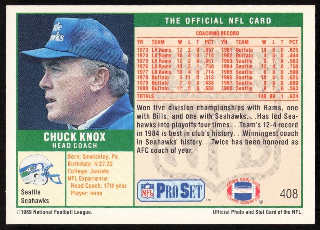 This Football card, from 1989 is part of the Pro Set card set. Chuck Knox is featured and has a card number of 408.