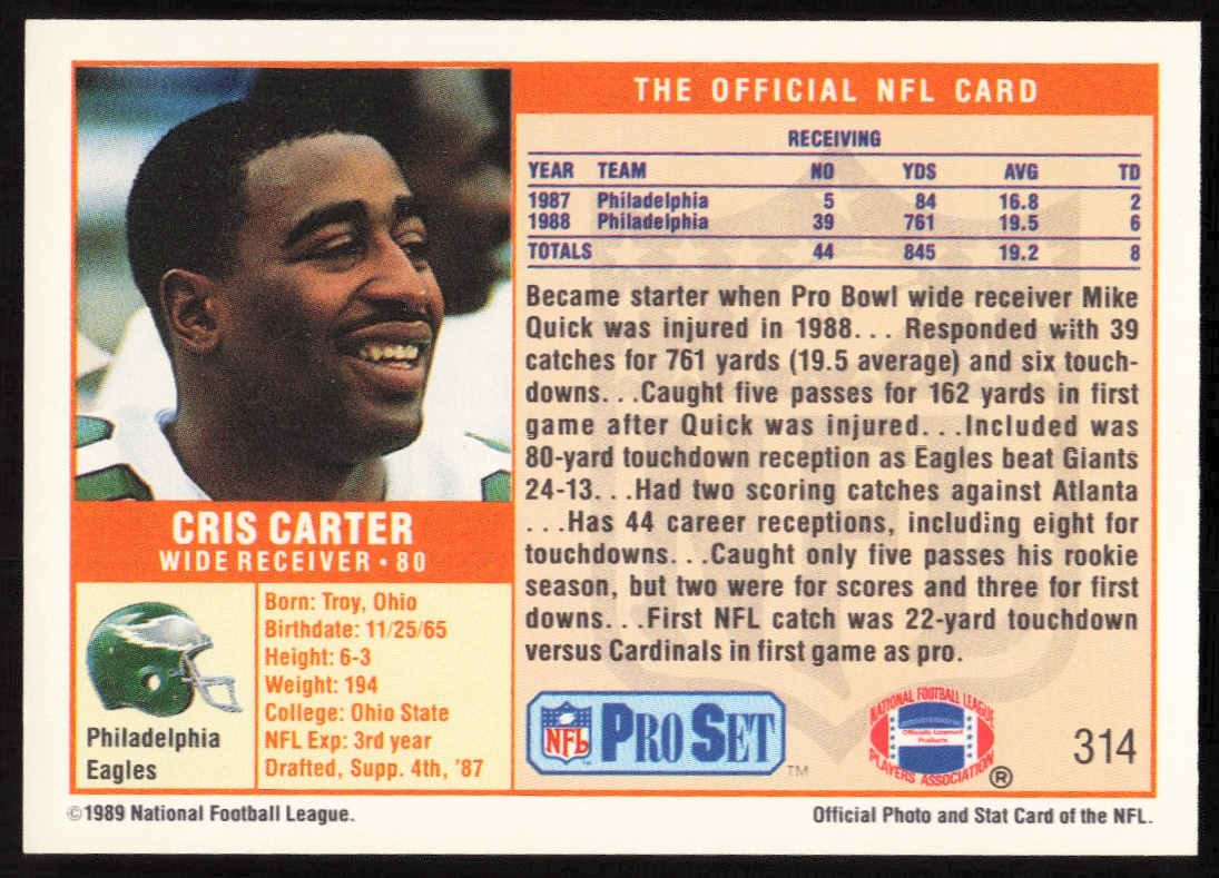 This Football card, from 1989 is part of the Pro Set card set. Cris Carter is featured and has a card number of 314.