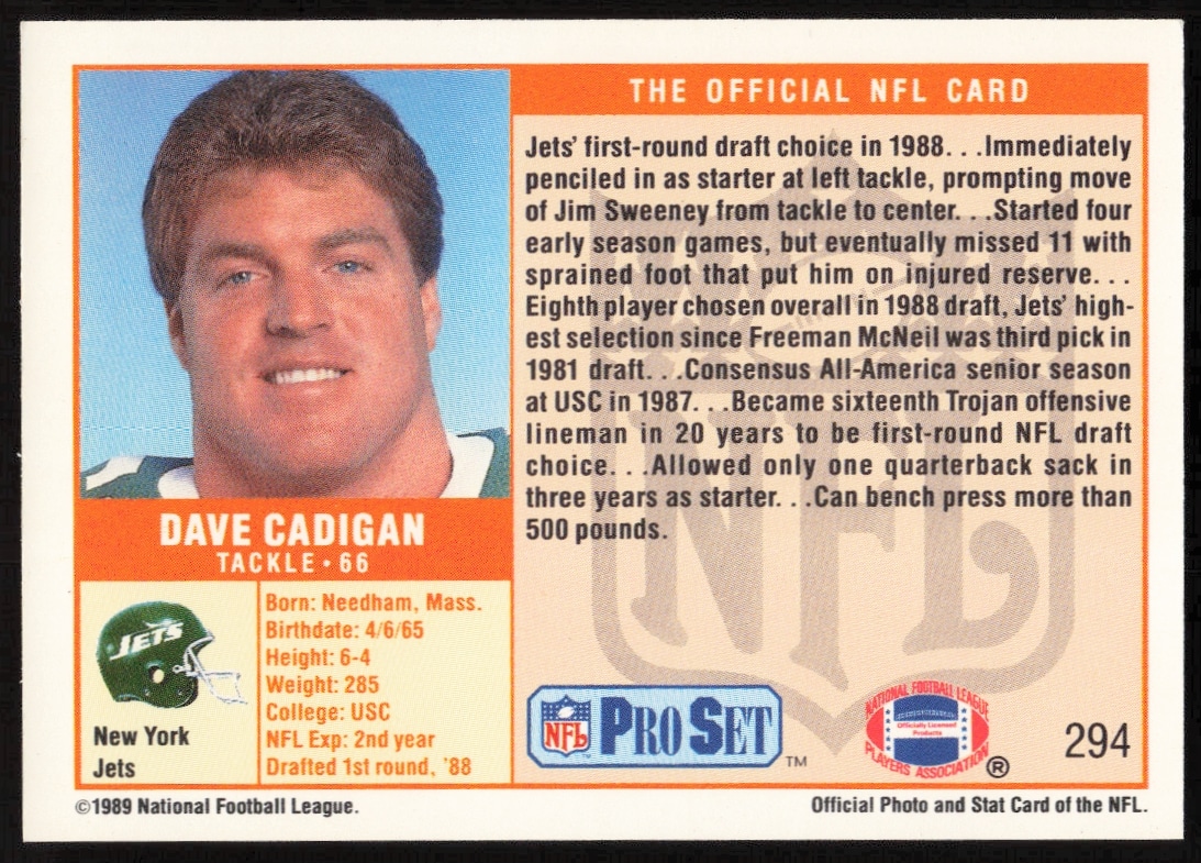 This Football card, from 1989 is part of the Pro Set card set. Dave Cadigan is featured and has a card number of 294.