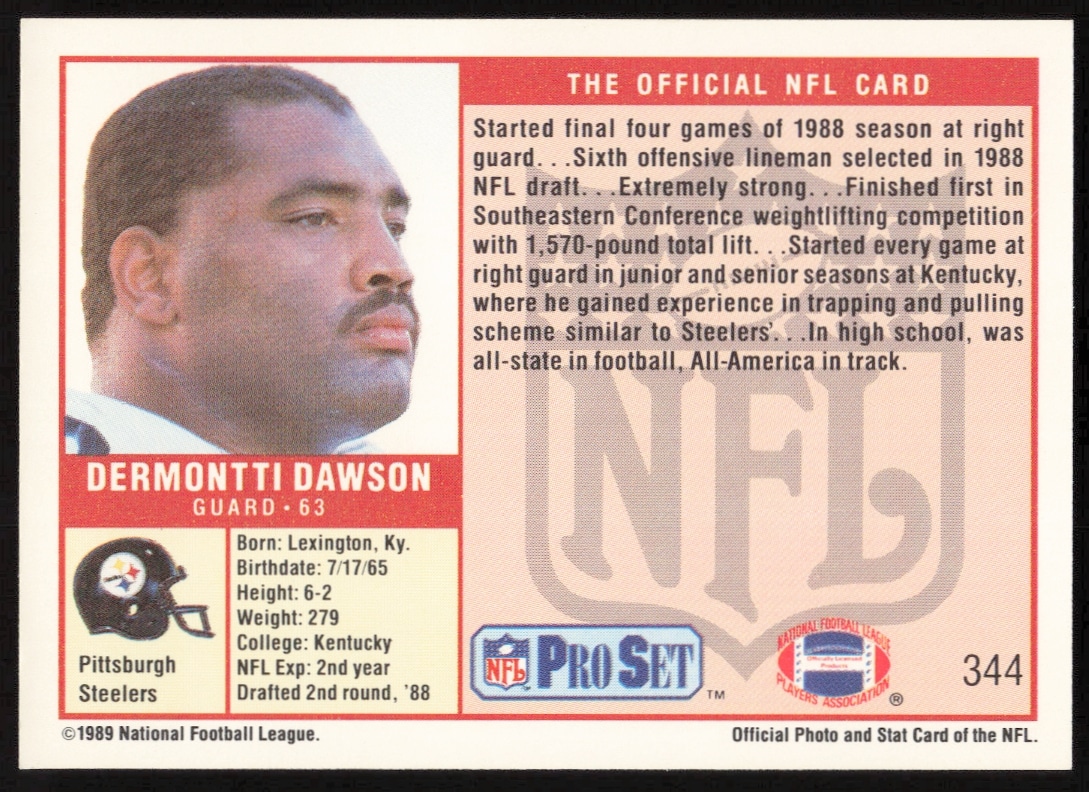 This Football card, from 1989 is part of the Pro Set card set. Dermontti Dawson is featured and has a card number of 344.