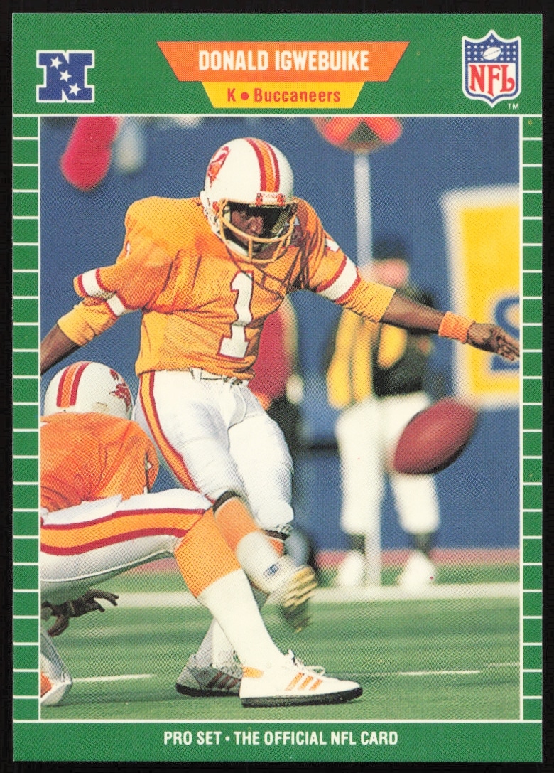 This Football card, from 1989 is part of the Pro Set card set. Donald Igwebuike is featured and has a card number of 414.