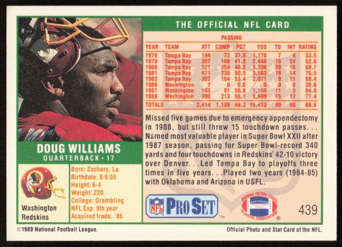 This Football card, from 1989 is part of the Pro Set card set. Doug Williams is featured and has a card number of 439.