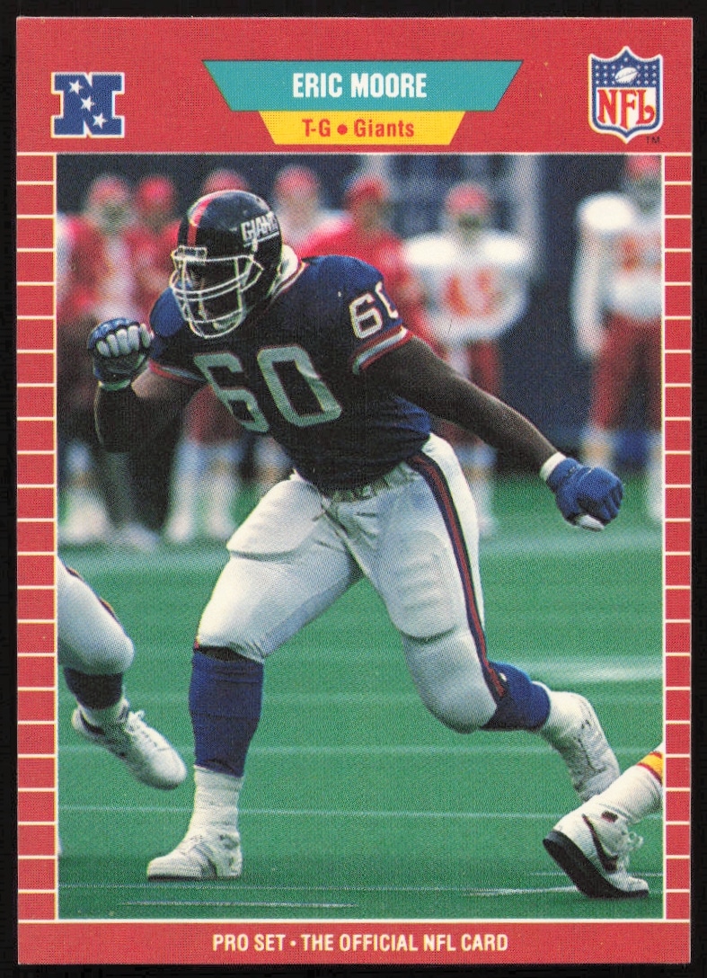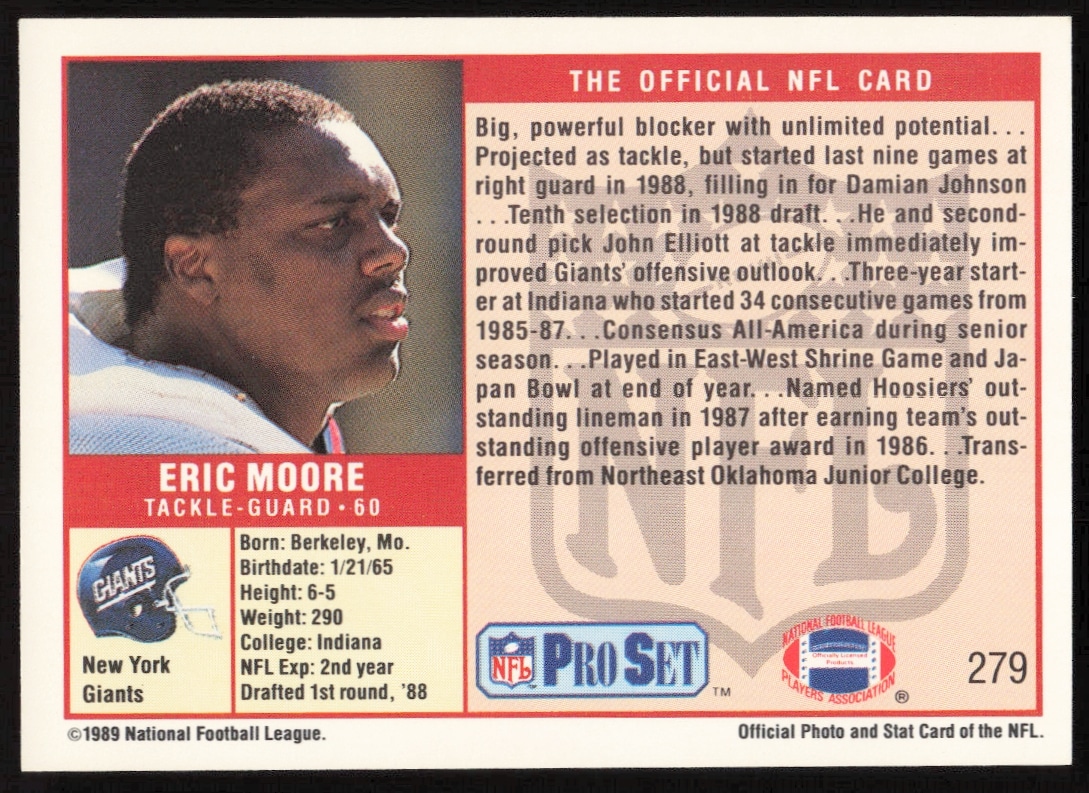 This Football card, from 1989 is part of the Pro Set card set. Eric Moore is featured and has a card number of 279.