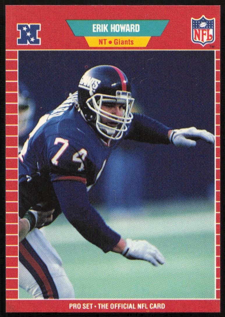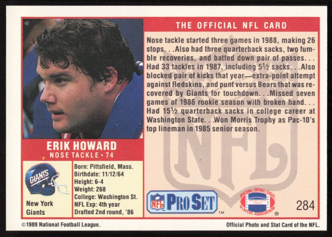 This Football card, from 1989 is part of the Pro Set card set. Erik Howard is featured and has a card number of 284.