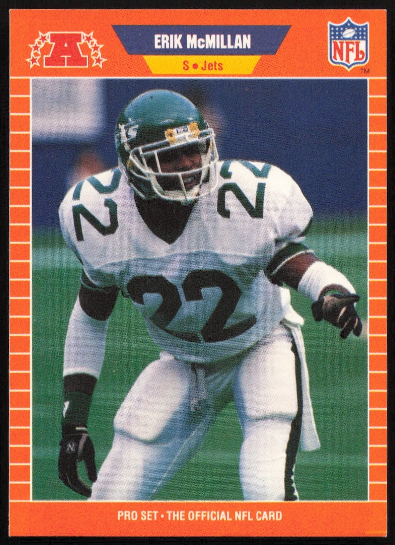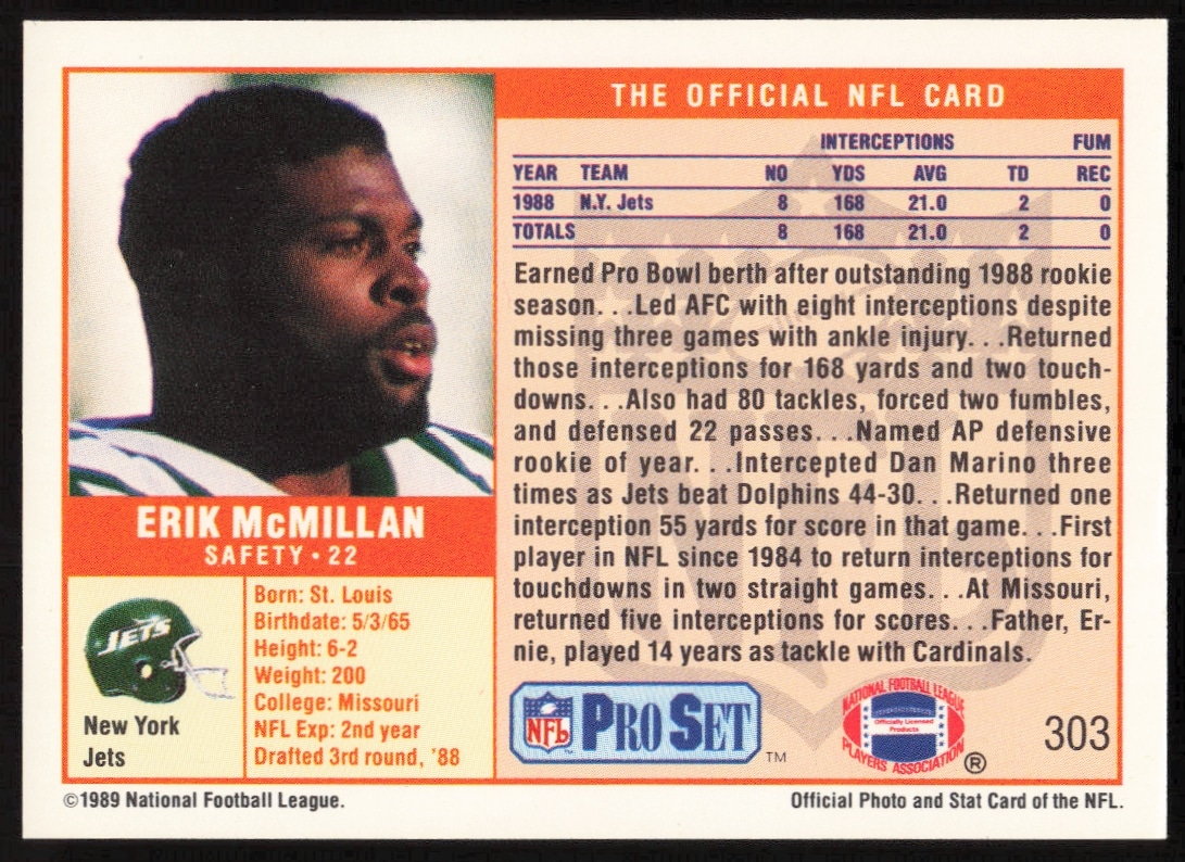 This Football card, from 1989 is part of the Pro Set card set. Erik McMillan is featured and has a card number of 303.