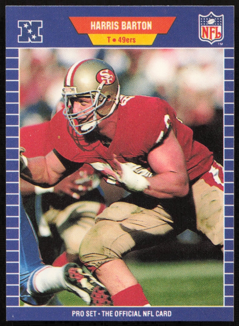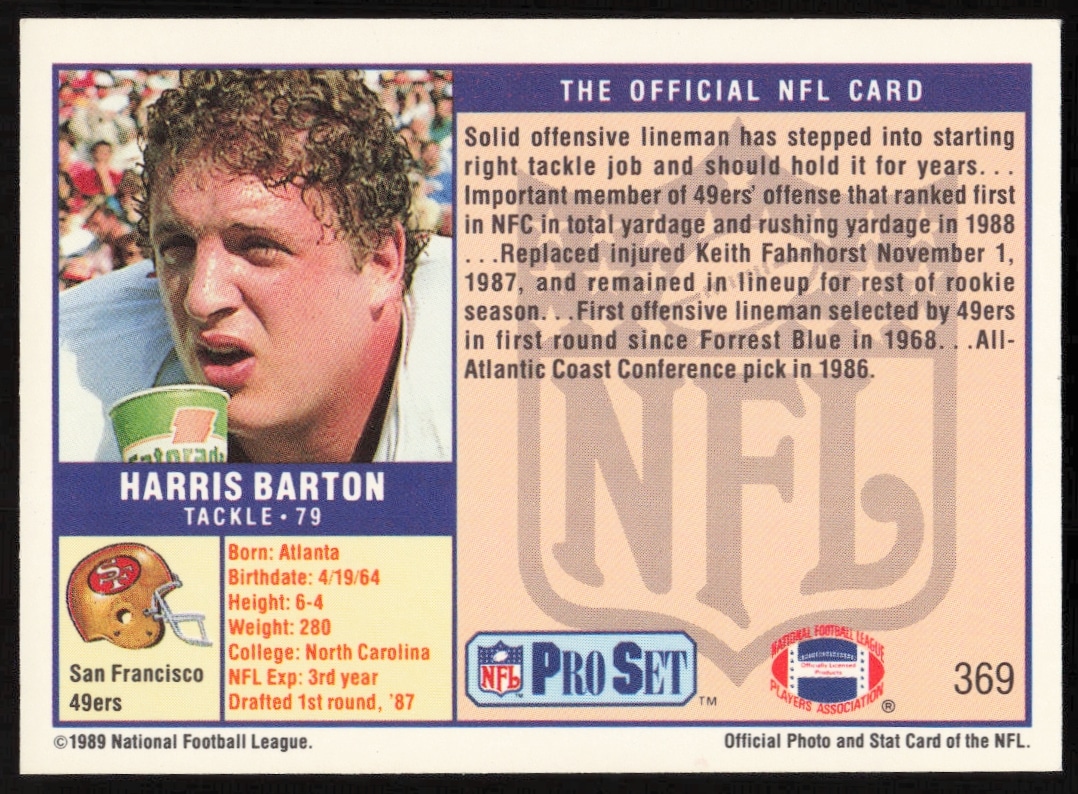 This Football card, from 1989 is part of the Pro Set card set. Harris Barton is featured and has a card number of 369.