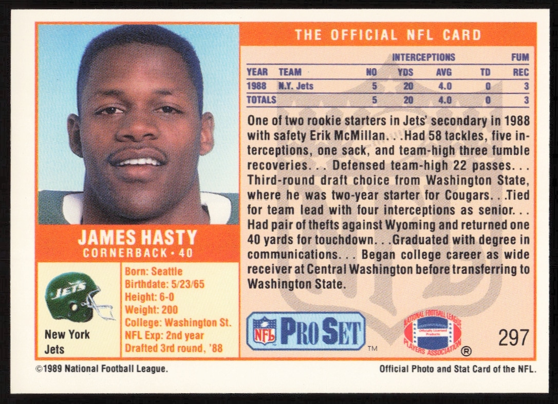 This Football card, from 1989 is part of the Pro Set card set. James Hasty is featured and has a card number of 297.