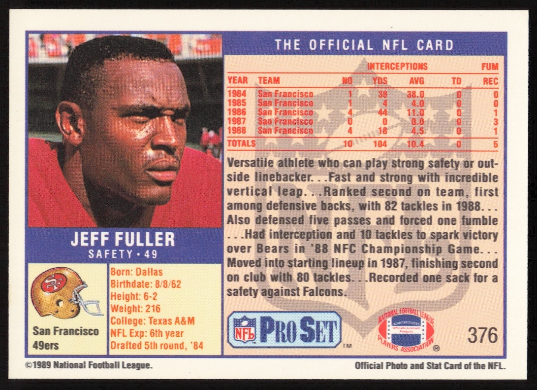 This Football card, from 1989 is part of the Pro Set card set. Jeff Fuller is featured and has a card number of 376.