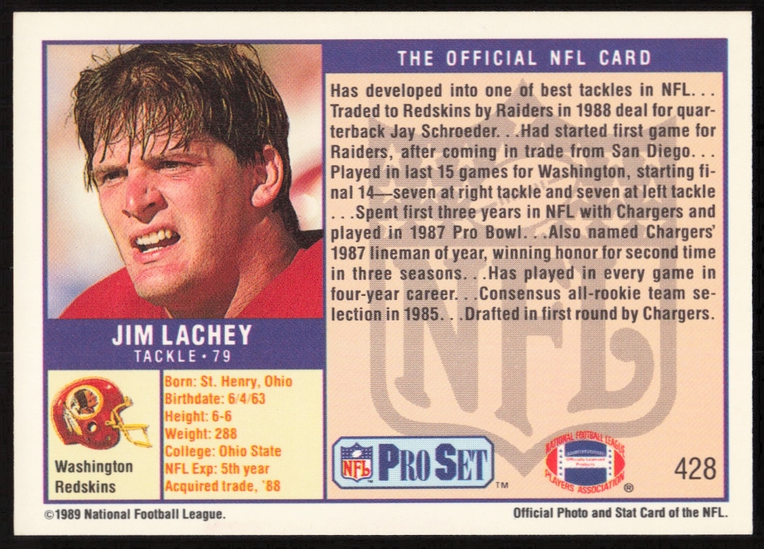 This Football card, from 1989 is part of the Pro Set card set. Jim Lachey is featured and has a card number of 428.