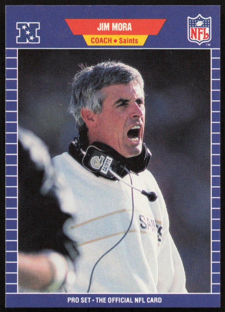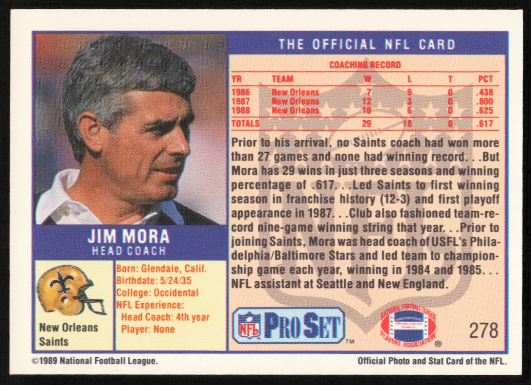 This Football card, from 1989 is part of the Pro Set card set. Jim Mora is featured and has a card number of 278.