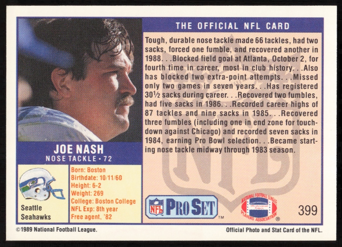 This Football card, from 1989 is part of the Pro Set card set. Joe Nash is featured and has a card number of 399.