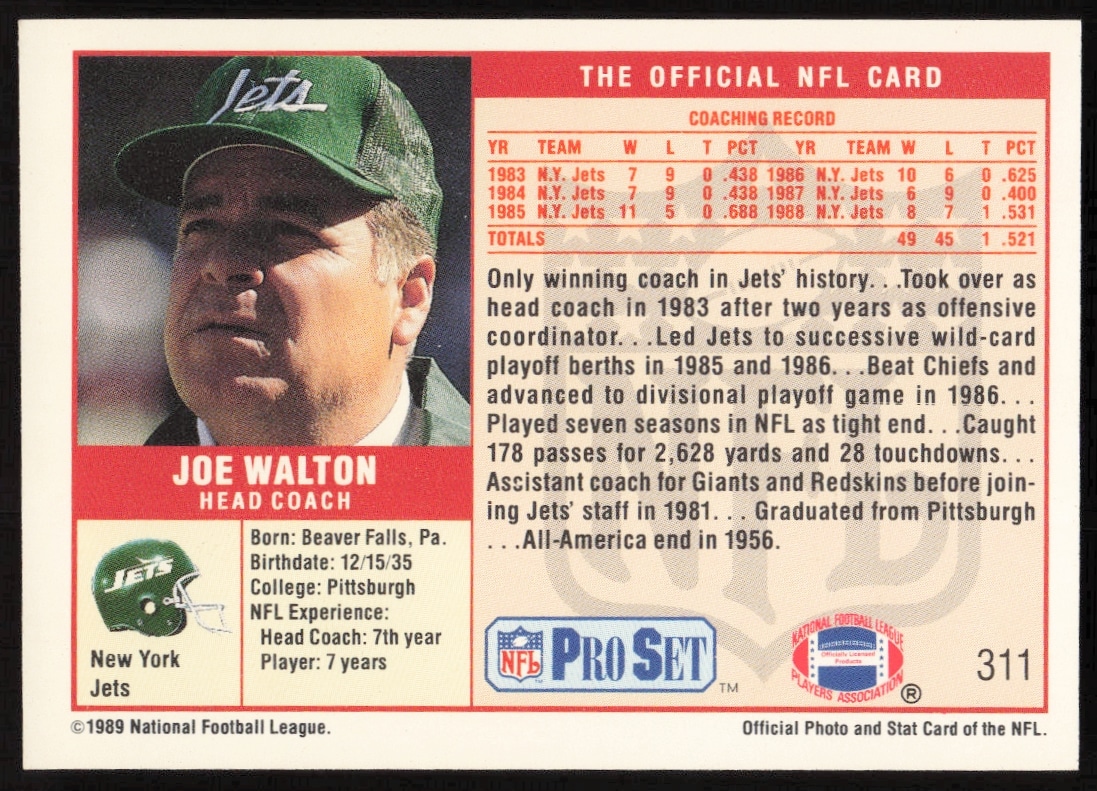 This Football card, from 1989 is part of the Pro Set card set. Joe Walton is featured and has a card number of 311.