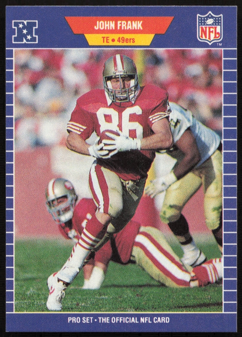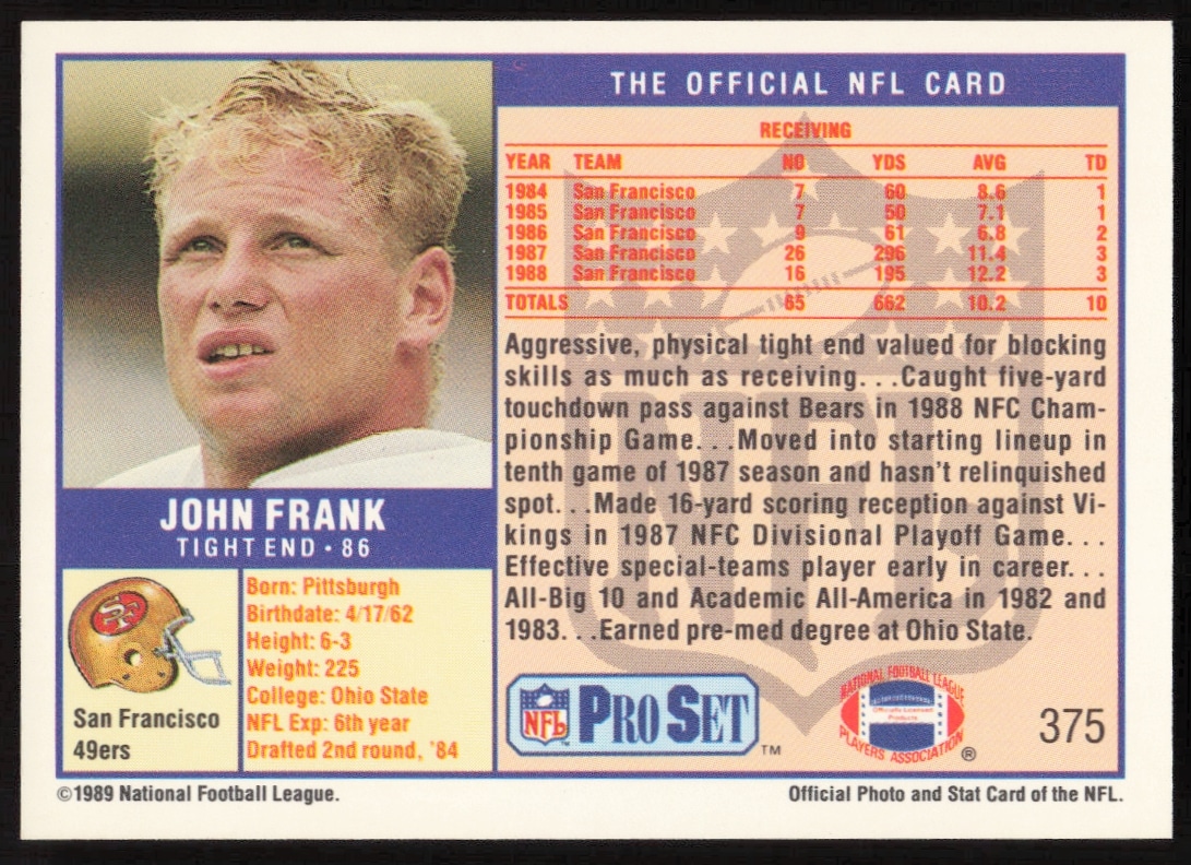 This Football card, from 1989 is part of the Pro Set card set. John Frank is featured and has a card number of 375.
