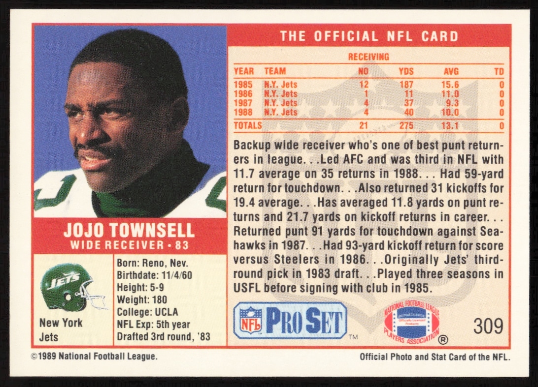 This Football card, from 1989 is part of the Pro Set card set. Jojo Townsell is featured and has a card number of 309.