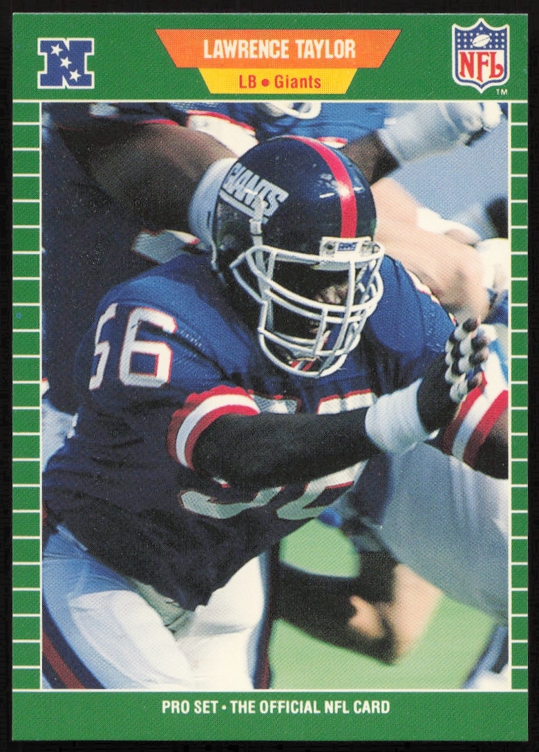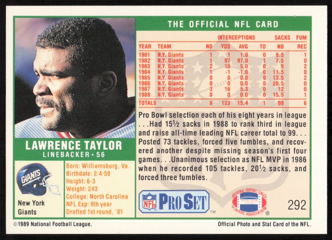 This Football card, from 1989 is part of the Pro Set card set. Lawrence Taylor is featured and has a card number of 292.