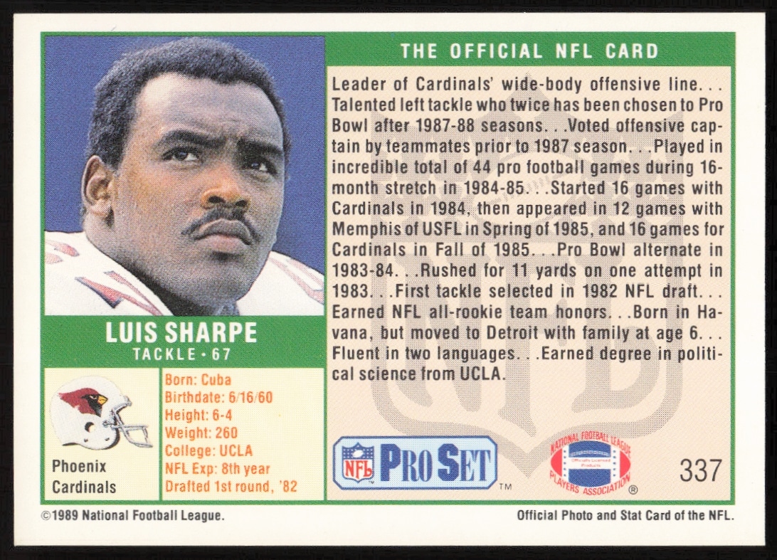 This Football card, from 1989 is part of the Pro Set card set. Luis Sharpe is featured and has a card number of 337.