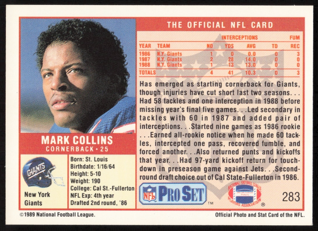 This Football card, from 1989 is part of the Pro Set card set. Mark Collins is featured and has a card number of 283.