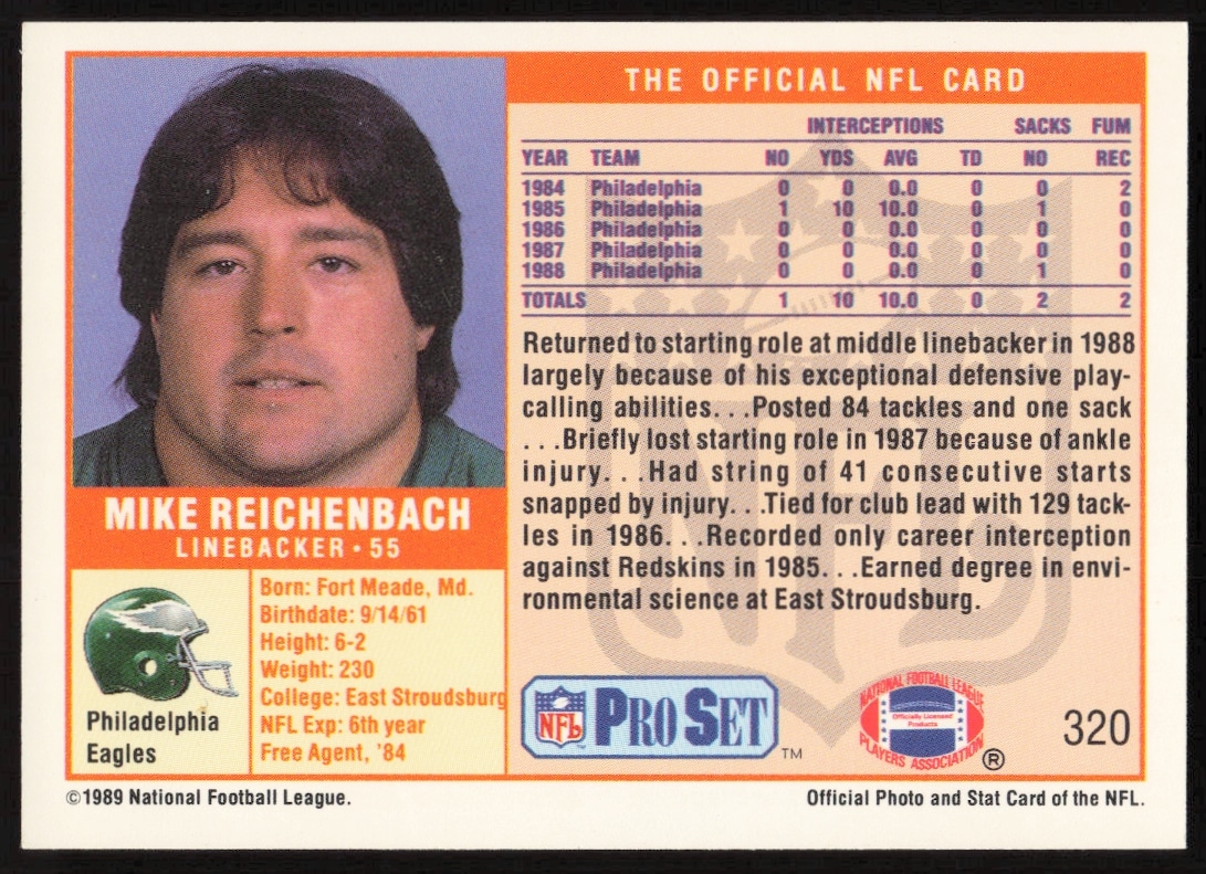 This Football card, from 1989 is part of the Pro Set card set. Mike Reichenbach is featured and has a card number of 320.