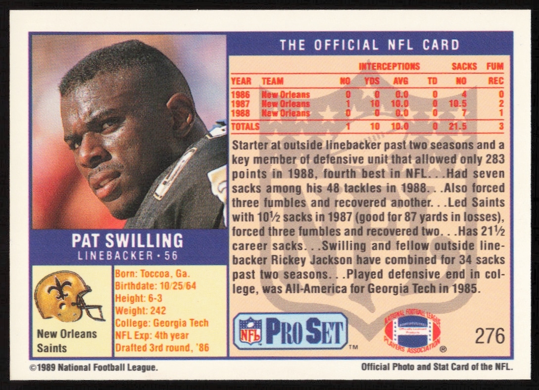 This Football card, from 1989 is part of the Pro Set card set. Pat Swilling is featured and has a card number of 276.