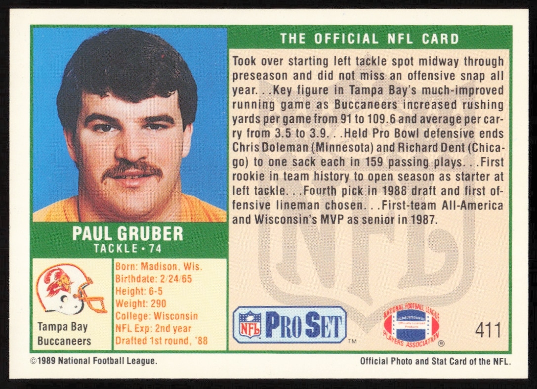 This Football card, from 1989 is part of the Pro Set card set. Paul Gruber is featured and has a card number of 411.