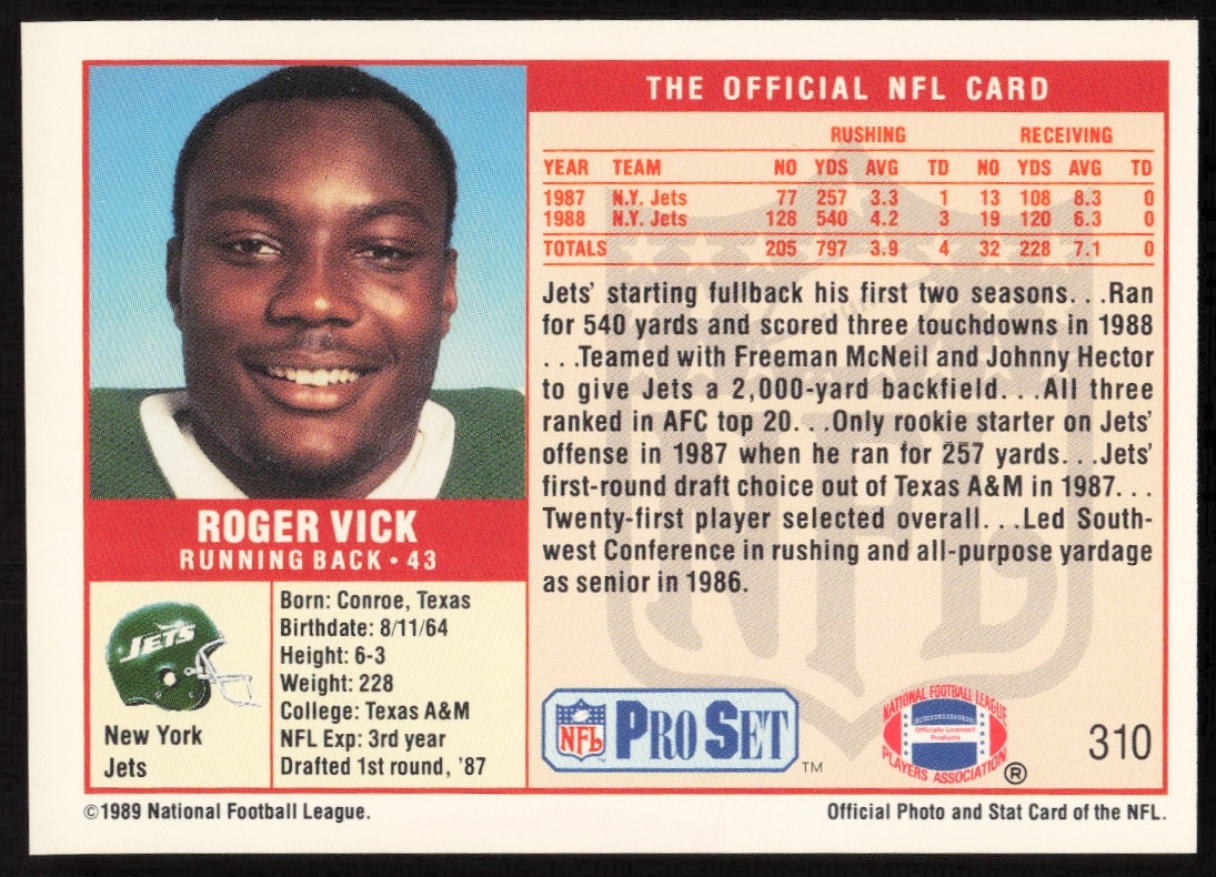 This Football card, from 1989 is part of the Pro Set card set. Roger Vick is featured and has a card number of 310.