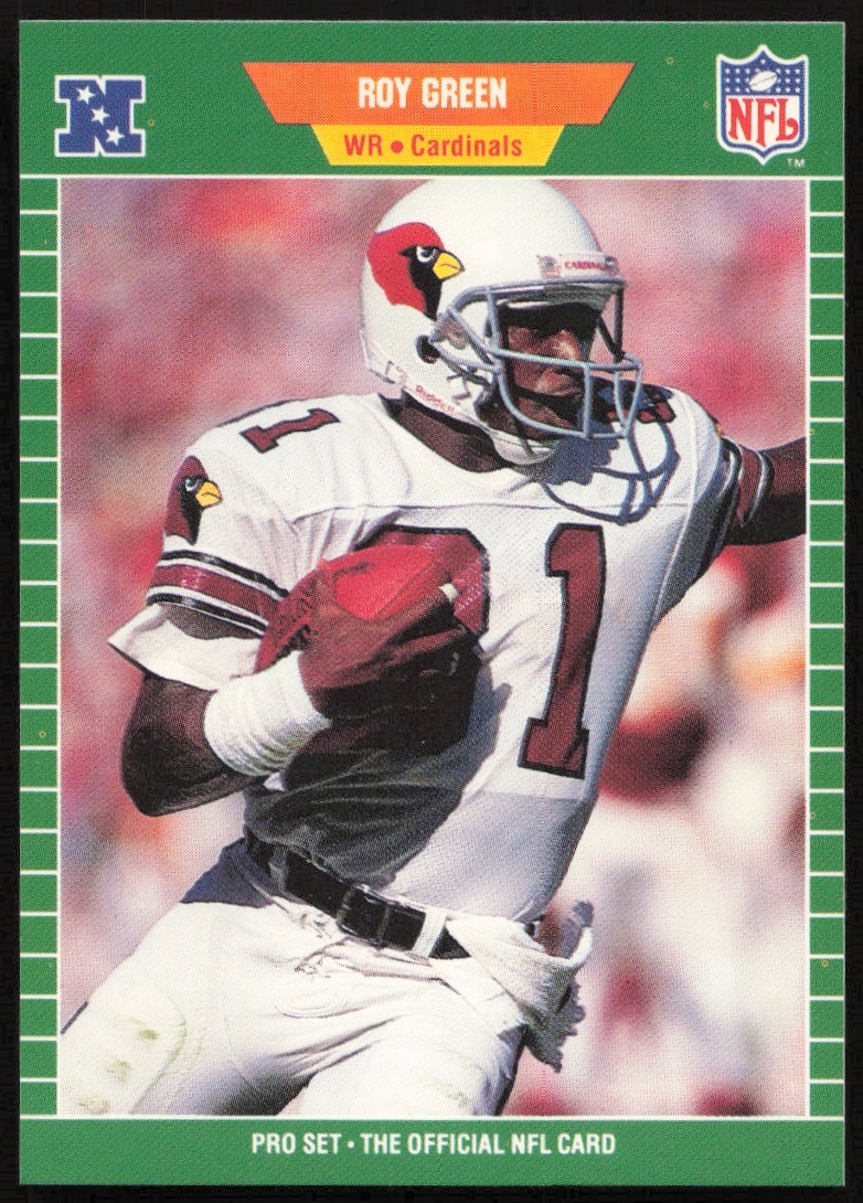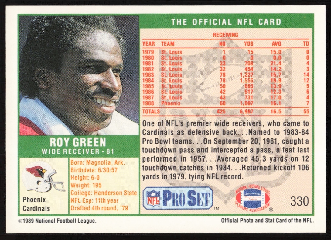 This Football card, from 1989 is part of the Pro Set card set. Roy Green is featured and has a card number of 330.
