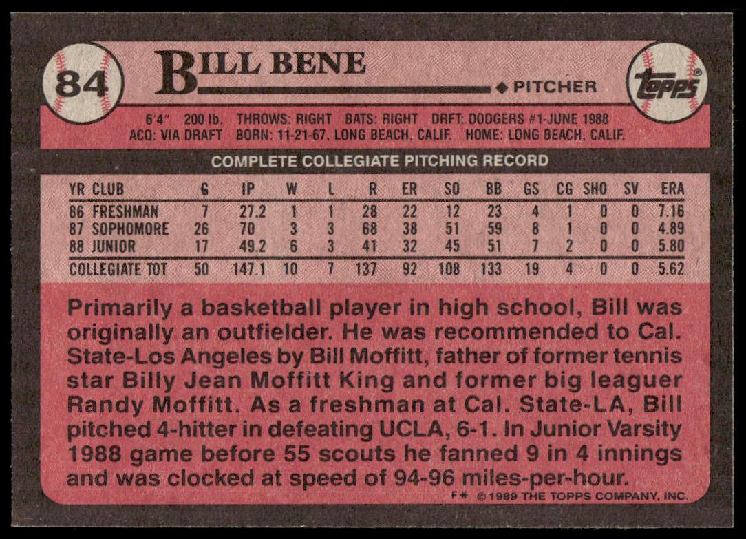 This Baseball card, from 1989 is part of the Topps  card set. Bill Bene is featured and has a card number of 84.