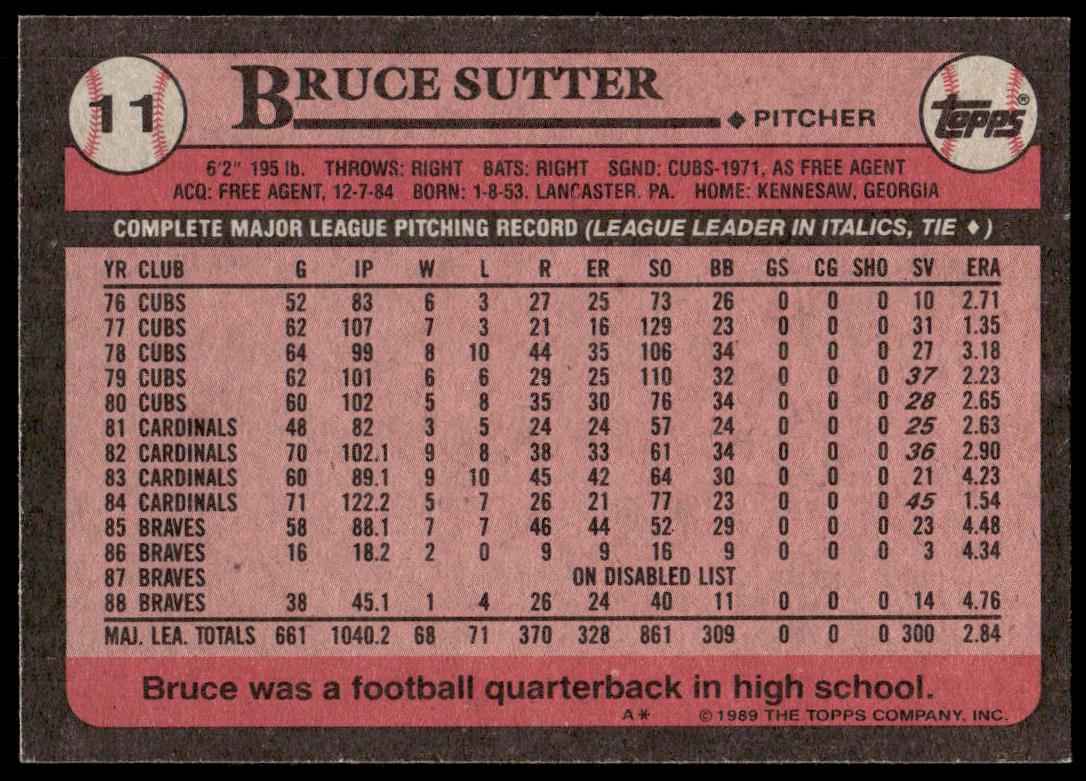 This Baseball card, from 1989 is part of the Topps  card set. Bruce Sutter is featured and has a card number of 11.